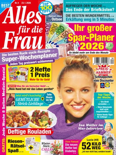 Alles für die Frau ist die wöchentliche Ratgeber-Zeitschrift für Gesundheit, Ernährung, Kochen, Backen, Mode, Schönheit und Wohnen. Im Abonnement kommt Alles für die Frau direkt zu Ihnen nach Hause.